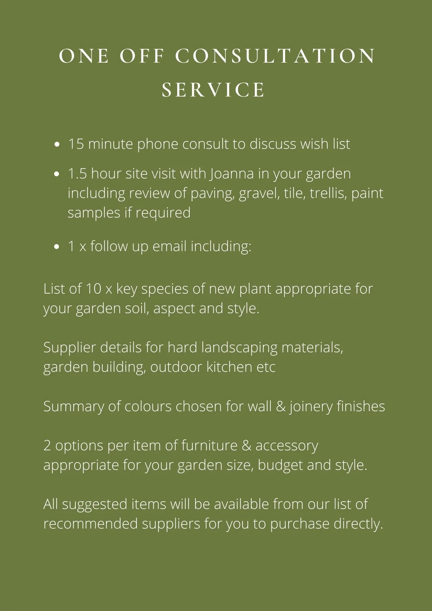 “After years of indecision and paralysis over what to do with our garden, Joanna’s consultation services appeared like manna from heaven. I have been left with a comprehensive plan comprising of planting ideas, furniture recommendations, suppliers and the list goes on. Joanna was brilliant at listening to me and her ideas are a game changer. Since our appointment I have thoroughly enjoyed ticking things off the suggestions she gave me and I am able to do it at my pace and budget. I wouldn’t hesitate to recommend the consultation process and think that the headspace it has freed up for me and the ideas provided make it money very well spent.” L.B.